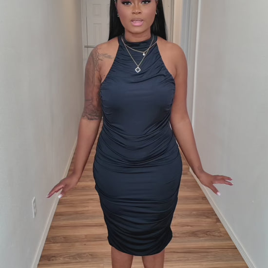 Women’s High Neck “Little Black”Ruched Midi Dress SZ L